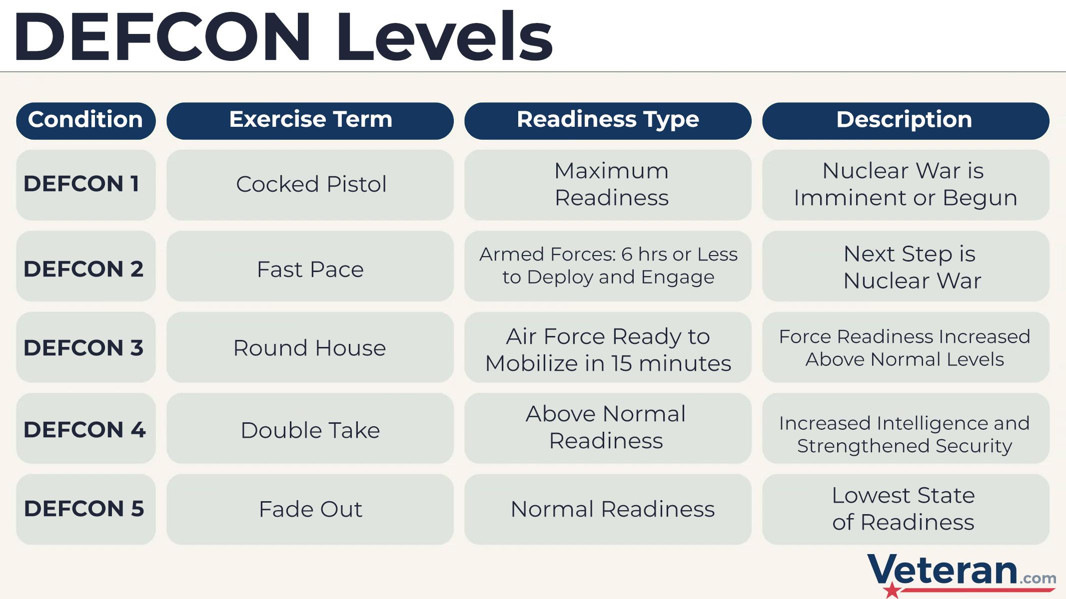DEFCON stands for Defense Readiness Condition. Levels range from DEFCON 1 to DEFCON 5, with DEFCON 1 being the highest level of readiness. To the public’s knowledge, the U.S. has never reached DEFCON 1.