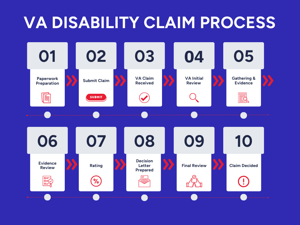 - Rating: The VA will decide your claim and assign your disability rating. If anything changes or new evidence is submitted, the process returns to Step 3.