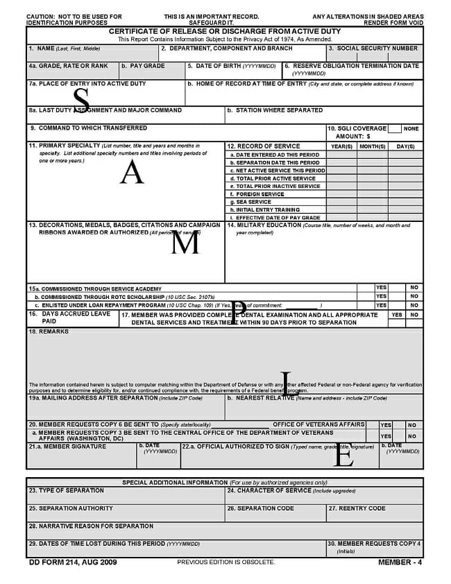 The DD Form 214 is broken down into blocks. Each one requires a specific piece of information, starting with the first block for the service member’s full legal name and ending with Block #30. indicating whether or not the service member has requested the full, unredacted “Member 4” copy of the DD Form 214.