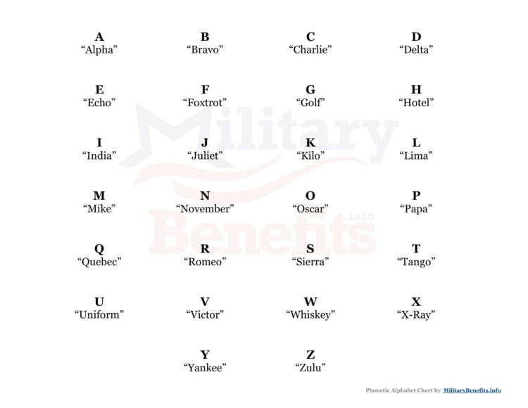 Because many letters in the English language sound similar—as in, “M” and “N” or “B” and “D”—the Military Phonetic Alphabet is crucial to help service members relay mission status, locations, codes, and other important information. For example, if directions are being issued to “muster at building DMG,” proper use of the phonetic alphabet would be to say “muster at building Delta-Mike-Golf.”