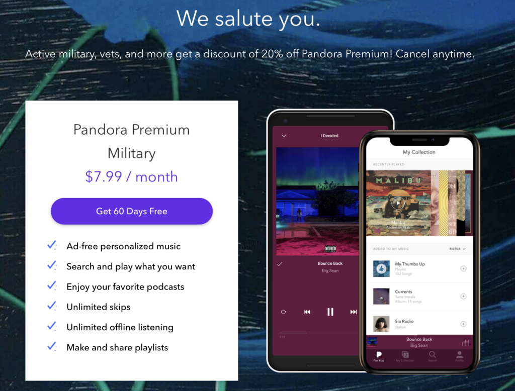 Qualified service members and their families will receive a Premium Pandora Membership. The Pandora Military Plan is offered at a 20% discount of $7.99 a month with a 60-day free trial.