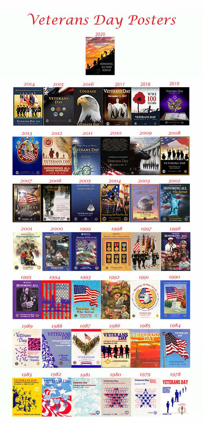 Veterans Day posters from 1978 to 2021 provided by the U.S. Department of Veterans Affairs. Each year the VA and the Veterans Day National Committee distribute Veterans Day posters to increase awareness of Veterans Day and the sacrifices Veterans have made to secure and defend our nation. More than 20,000 Veterans posters are distributed to military installations, federal agencies, veterans nursing homes, state veterans offices, VA facilities and many other locations. The poster also appears on the official program for the Veterans Day Celebration at Arlington National Cemetery and establishes the theme for the ceremony.
